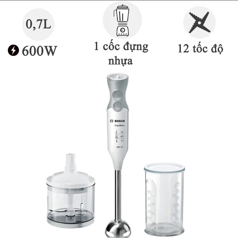 Máy xay cầm tay Bosch MSM66150 trang bị động cơ 600W giúp việc xay trộn nhanh chóng hơn. Kết hợp cùng các phụ kiện đi kèm, kết quả xay trộn của bạn sẽ trở nên hoàn hảo hơn.