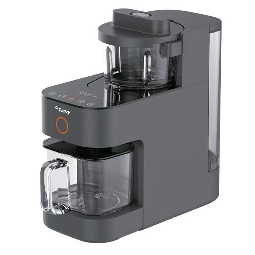 Nhìn tổng thể máy làm sữa hạt Canzy CZ-780K có thiết kế dạng phân tầng. Tầng trên cùng là khoang chứa nguyên liệu xay. Ở giữa nhô ra phía trước chính là bảng điều khiển. Tiếp là bảng điều khiển cảm ứng. Tầng dưới cùng chính là động cơ ở phía sau và phía trước là nơi lấy sữa thành phẩm và khoang chứa nước thải sau khi vệ sinh. Phía sau vẫn là bình đựng nước. Máy Canzy CZ-780K sẽ tự lấy nước để làm sữa hạt.