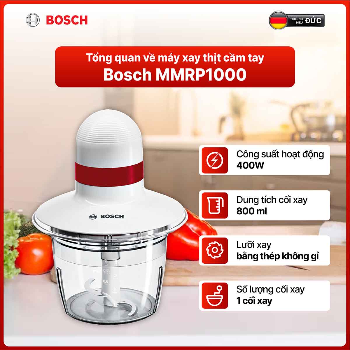 Động cơ 400W mạnh mẽ mang đến hiệu năng xay thực phẩm tối đa. Với chiếc máy xay Bosch MMRP1000 trên tay, bạn dễ dàng xay nhuyễn nhiều loại thực phẩm khác nhau. Chẳng hạn như: