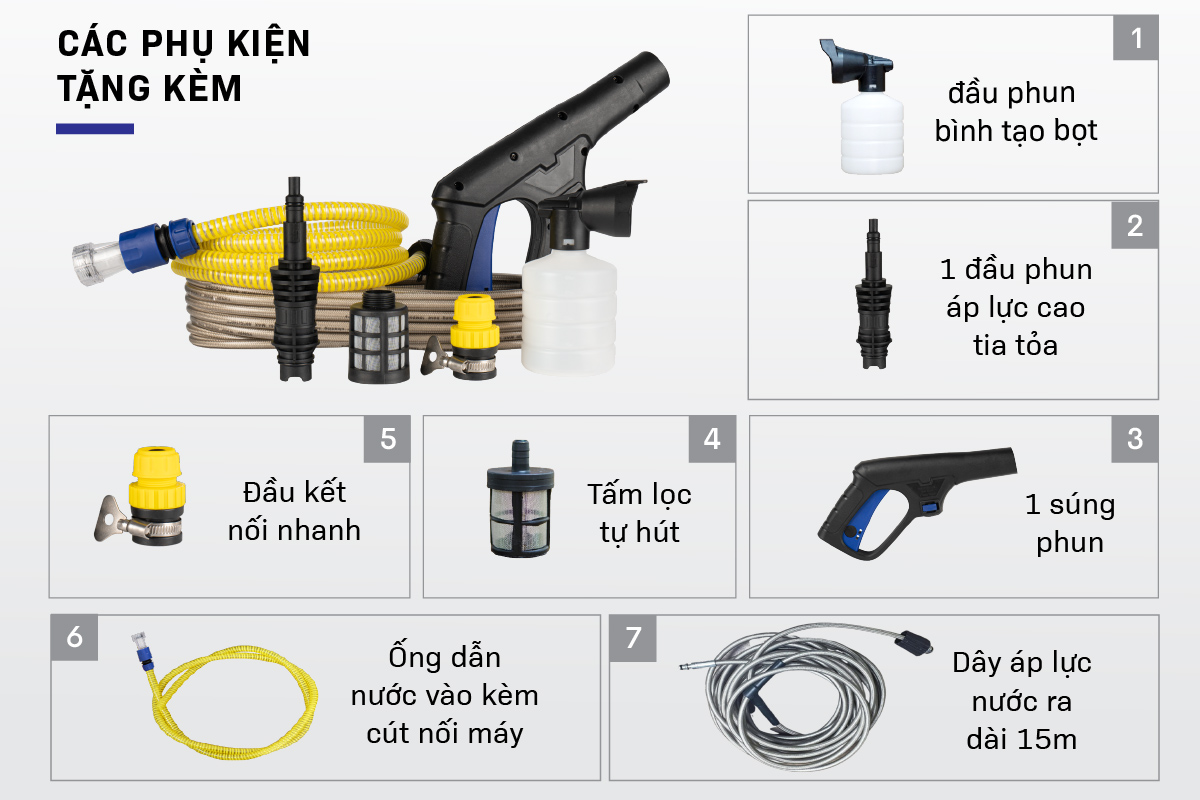 Với áp lực nước cao giúp loại bỏ các vết bẩn một cách nhanh chóng, cho phép tẩy rửa các vết bẩn ở những vị trí khó thao tác như gầm xe, bánh xe một cách dễ dàng.
