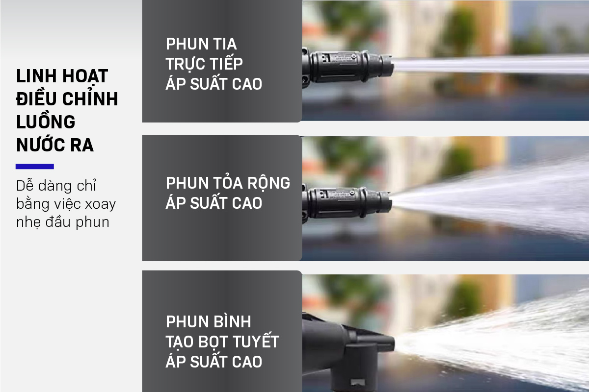 Súng phun có thể điều chỉnh tia nước theo 3 kiểu giúp xịt rửa linh hoạt theo mục đích sử dụng.