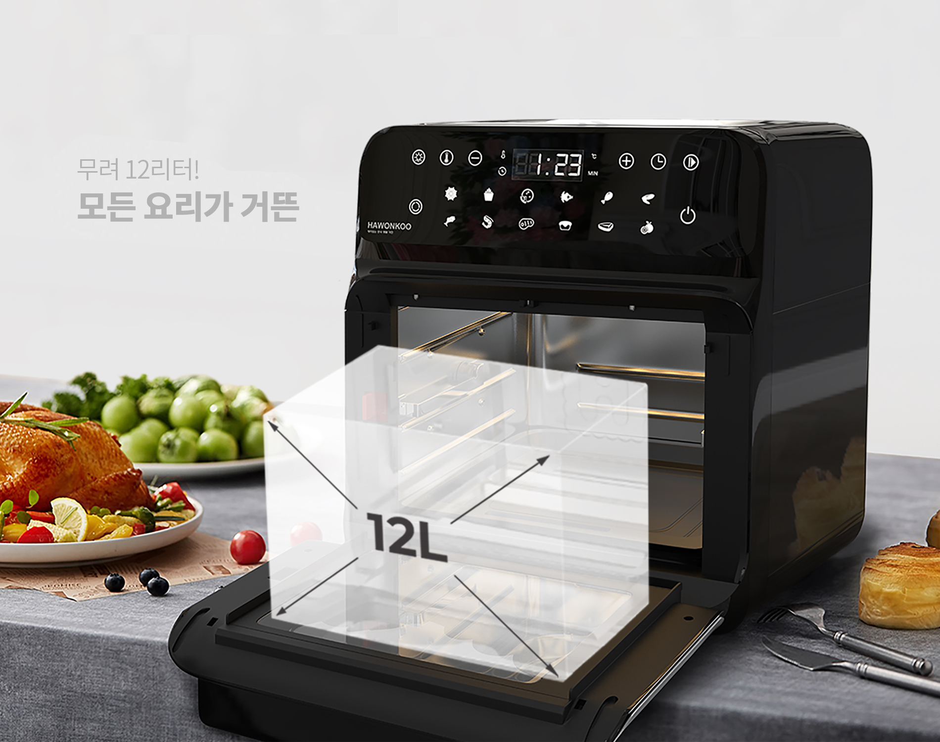 Nồi chiên không dầu AFH-120 có dung tích “khủng” 12 lít, phần khoang chiên rộng rãi có thể quay gà, vịt, cá nguyên con hoặc chế biến nhiều loại thực phẩm cùng một lúc.