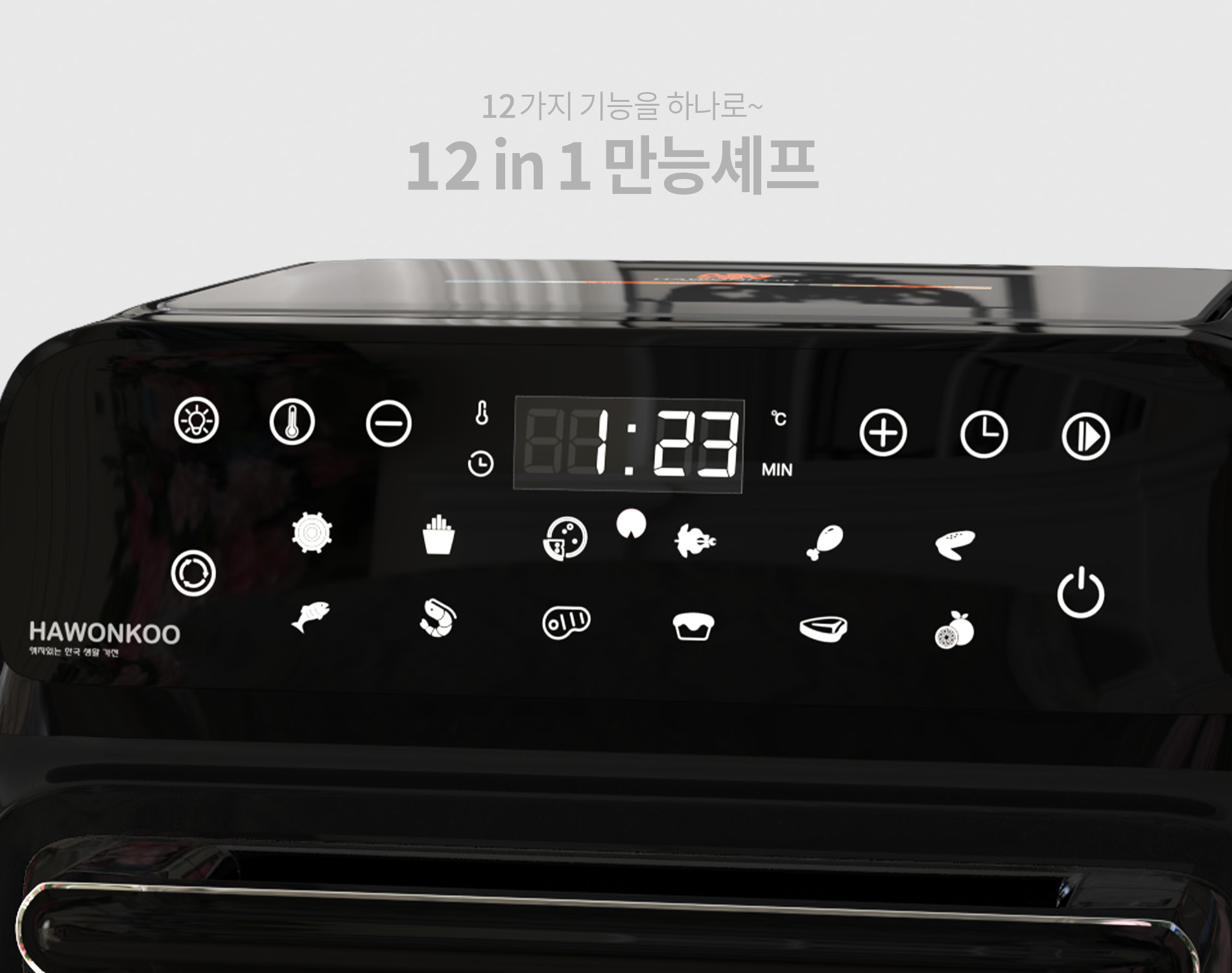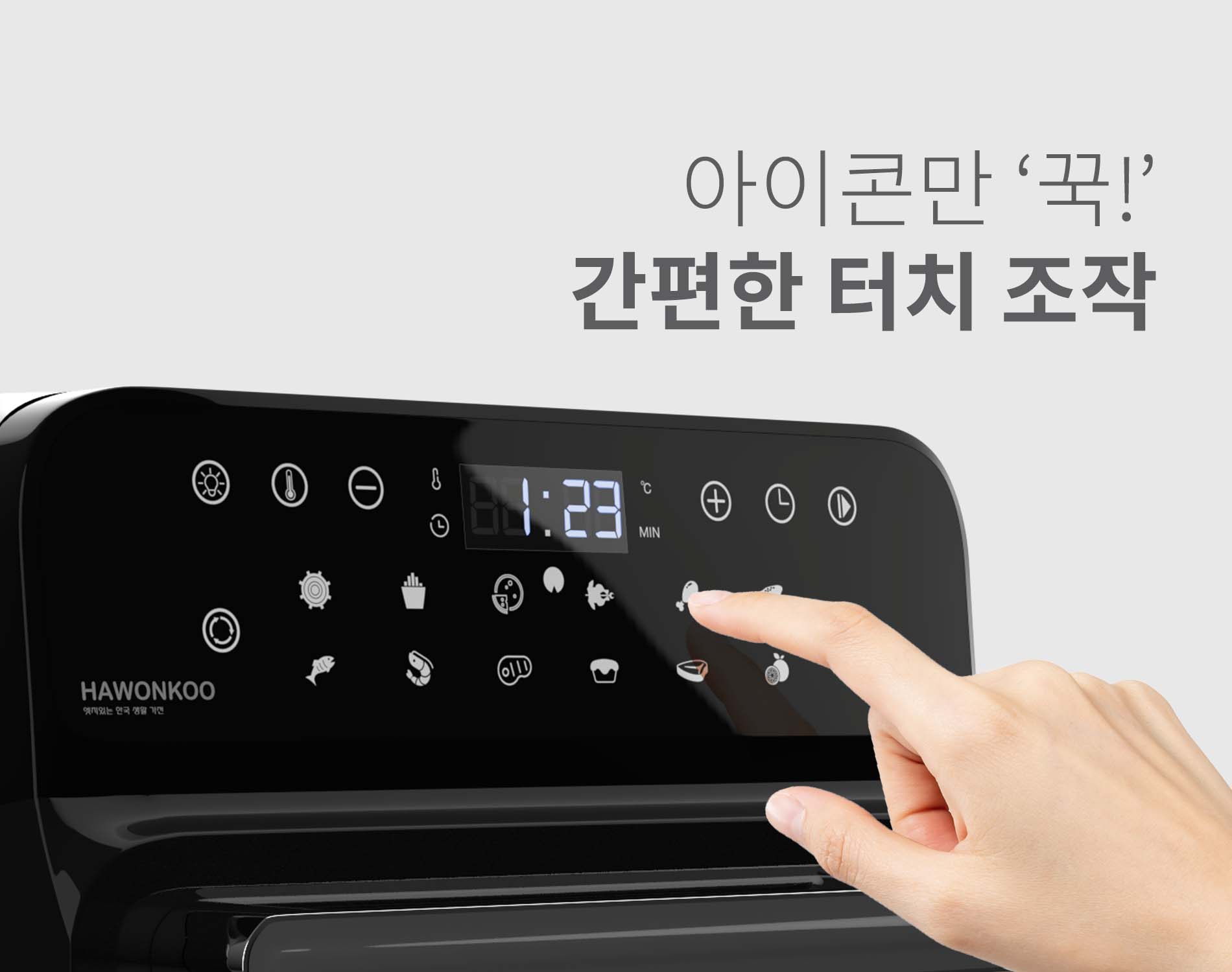 Nồi chiên không dầu Hawonkoo AFH-120 được trang bị bảng điều khiển cảm ứng hiện đại. Mỗi chức năng được minh họa biểu tượng dễ hiểu và sử dụng, phù hợp với mọi đối tượng, kể cả người lớn tuổi và những người ít tiếp xúc với đồ dùng công nghệ.