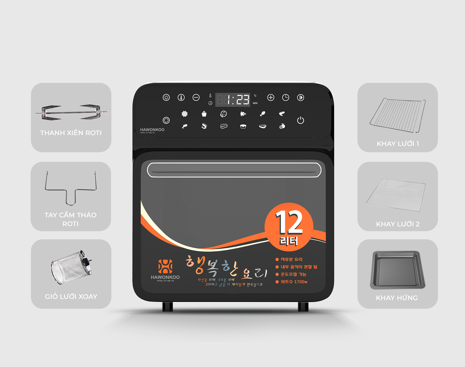 Nồi chiên không dầu Hawonkoo AFH-120 đi kèm bộ phụ kiện đầy đủ chất liệu Inox 403, giúp bạn nấu nướng mọi món ngon: 2 khay lưới, 1 khay hứng, 1 thanh xiên roti, 1 tay cầm tháo roti, 1 giỏ lưới xoay, 2 đầu thanh xiên roti.