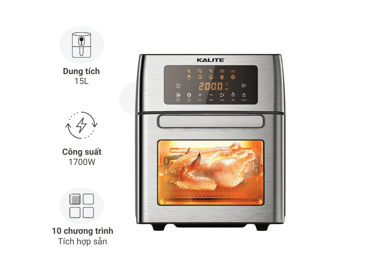 – Nồi chiên không dầu Kalite KL-1500 sở hữu thiết kế hiện đại, kết hợp giữa nồi chiên không dầu và lò nướng, khoang lò rộng, cửa kính trong suốt thuận tiện cho việc nấu nướng.