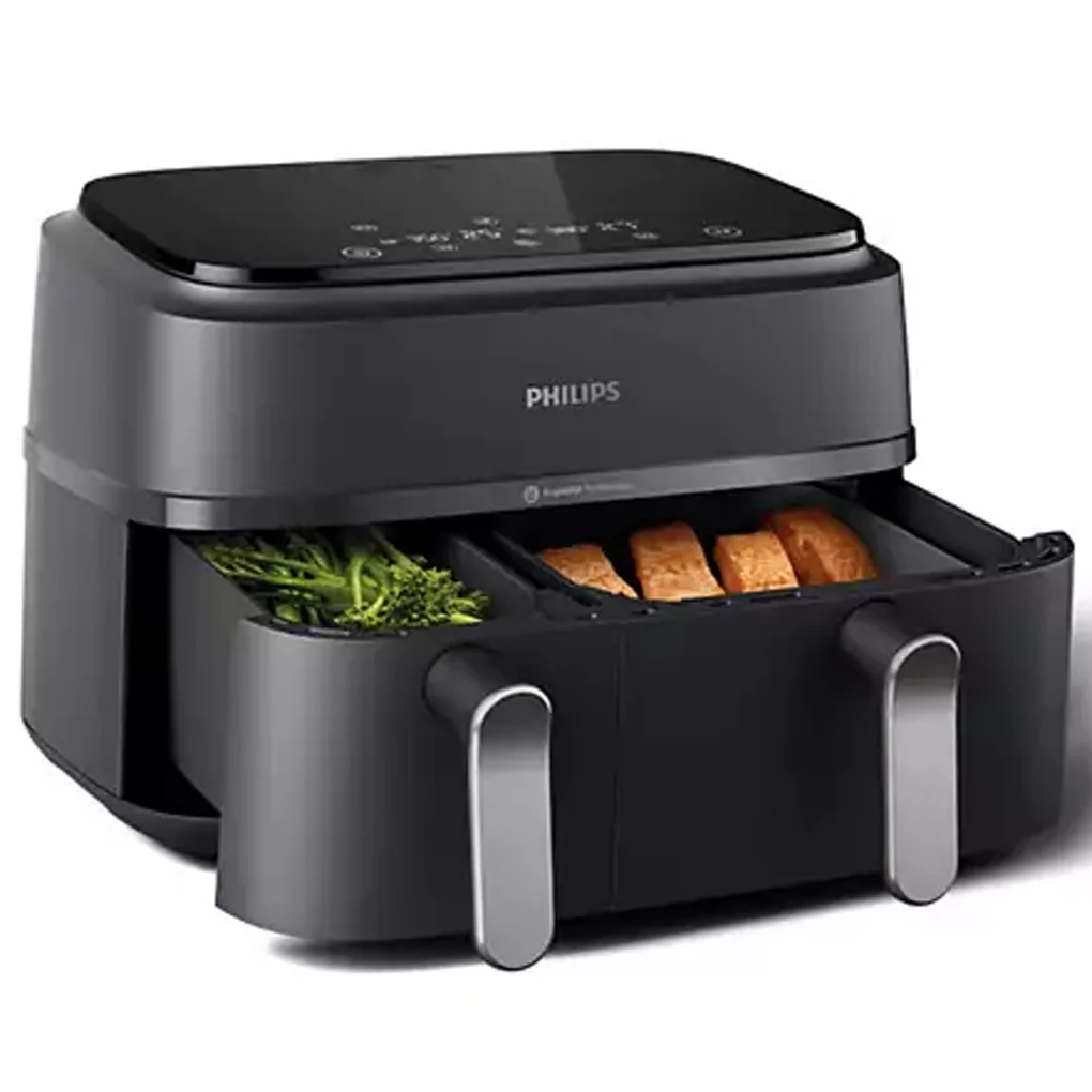 Nồi chiên không dầu Philips 9 lít NA352/00 có dung tích tổng 9 lít, dung tích sử dụng 1 ngăn 3 lít và 1 ngăn 6 lít lít có thể chiên, nướng nhiều loại thực phẩm khác nhau kết hợp cùng công suất 2750W giúp thức ăn chín nhanh hơn, tiết kiệm thời gian nấu nướng, thích hợp sử dụng cho gia đình có đông thành viên. Ngăn nhỏ 3 lít phù hợp nấu rau củ, khoai tây chiên,… còn ngăn lớn 6 lít đảm bảo bữa ăn đủ dinh dưỡng với protein từ thịt, cá cho gia đình bạn.