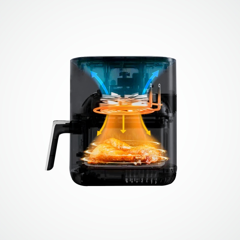 Thiết kế khay đựng bằng thủy tinh trong suốt cho phép bạn quan sát trực tiếp quá trình nấu nướng, dễ dàng theo dõi sự thay đổi của món ăn và điều chỉnh nhiệt độ, thời gian cho phù hợp, mang đến trải nghiệm nấu nướng thú vị và hấp dẫn. Công nghệ dòng nhiệt lốc xoáy 360° giúp nhiệt lượng lan tỏa đều khắp khoang nồi, làm cho món ăn chín đều, vàng giòn từ mọi phía, đảm bảo hương vị thơm ngon và màu sắc hấp dẫn.