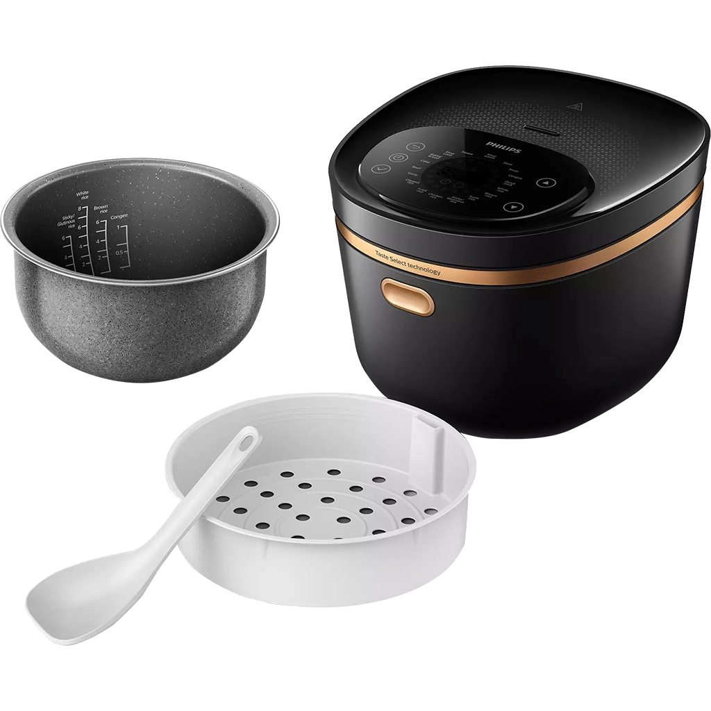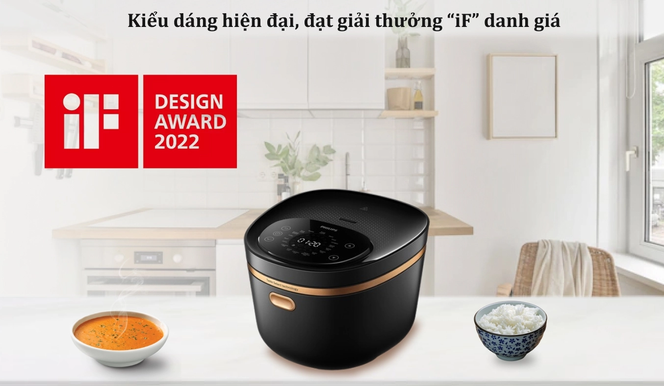 Nồi cơm điện cao tần Philips 1.5 lít HD4539/62 có thiết kế sang trọng cùng gam màu đen trang nhã điểm xuyết thêm màu vàng ánh kim tô điểm cho không gian bếp thêm phần hiện đại. Đặc biệt hơn, sản phẩm này còn đạt giải thưởng “Thiết kế iF” – 1 trong những giải thưởng danh giá của thế giới, con dấu iF biểu thị đây là thiết kế tốt dành cho người tiêu dùng và cộng đồng thiết kế nhờ kiểu dáng hài hòa với căn bếp, hiệu suất mạnh mẽ và tiện dụng với bảng điều khiển cảm ứng dễ sử dụng. Nồi cơm có dung tích 1.5 lít phù hợp với gia đình có từ 2 đến 4 thành viên.