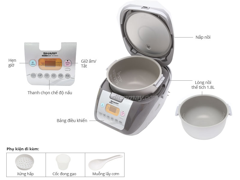 Nồi được tặng kèm muỗng múc cơm, cốc đong gạo và xửng hấp.