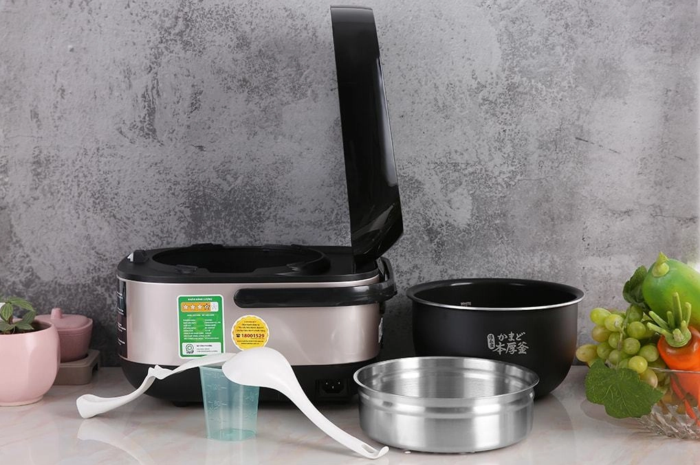 Nồi cơm điện Toshiba 1.8 Lít RC-18IX1PV sở hữu thiết kế chắc chắn, màu đen kết hợp vàng đồng sang trọng góp phần tôn thêm nét đẹp hiện đại của mọi không gian bếp của bạn. Ngoài ra, nồi còn tích hợp đa dạng chức năng nấu đa, với bảng điều khiển cảm ứng có màn hình hiển thị rõ ràng hỗ người dùng quan sát và đáp ứng nhu cầu sử dụng và chế biến thức ăn, hứa hẹn sẽ làm hài lòng hội chị em yêu bếp