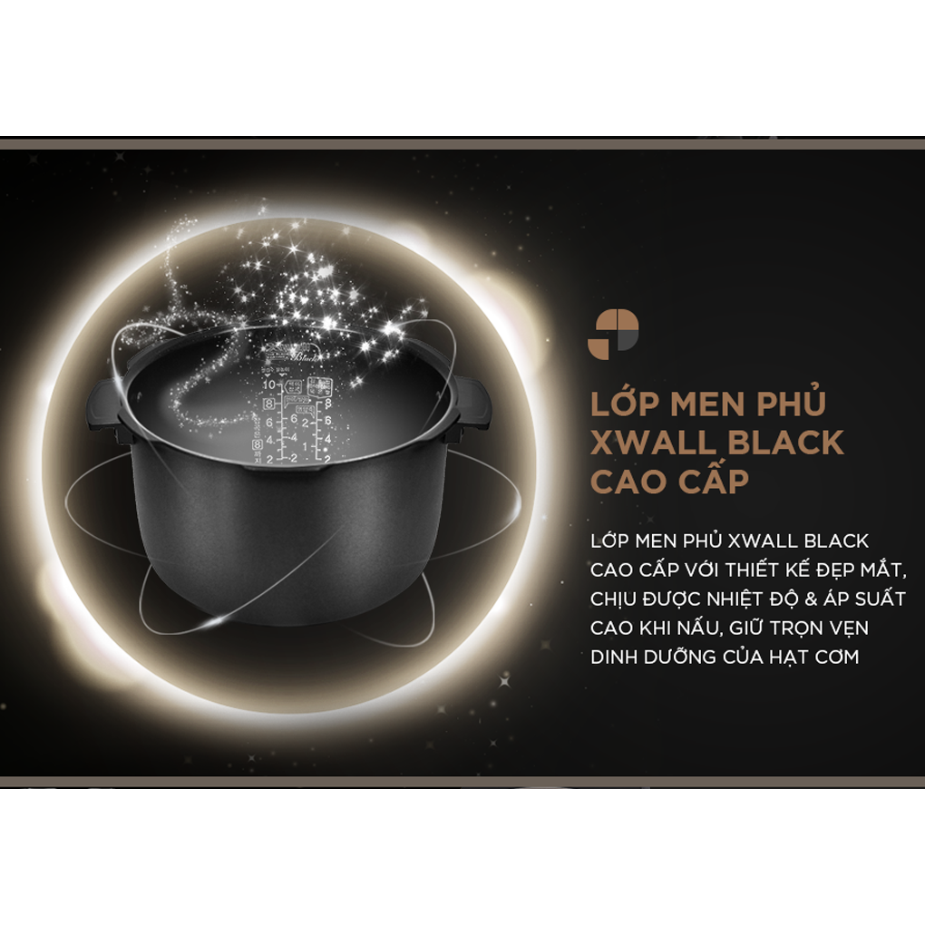 Lòng nồi được phủ men kim cương X-Wall độc quyền của Cuckoo, chống dính vượt trội, bền bỉ và an toàn cho sức khỏe. Công nghệ nấu 3D tỏa nhiệt từ ba hướng (trên, dưới và xung quanh), giúp cơm chín đều, dẻo thơm và giữ trọn dưỡng chất tự nhiên.