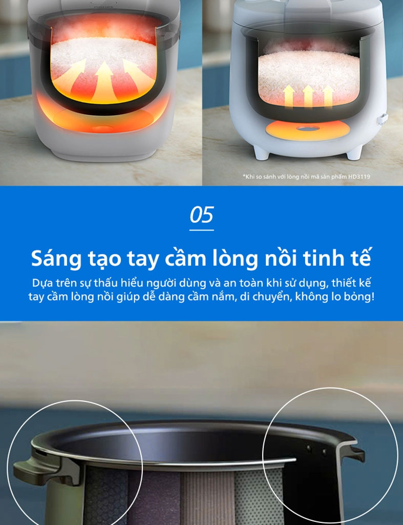 Công nghệ nhiệt 3D thông minh giúp nhiệt độ thẩm thấu sâu và đều khắp mọi góc cạnh của gạo, mang lại cơm chín đều, tơi xốp mà không bị khô hay nhão. Ngoài ra, lớp chống dính với bột kim cương giúp nồi không bị trầy xước, dễ dàng vệ sinh sau khi sử dụng.