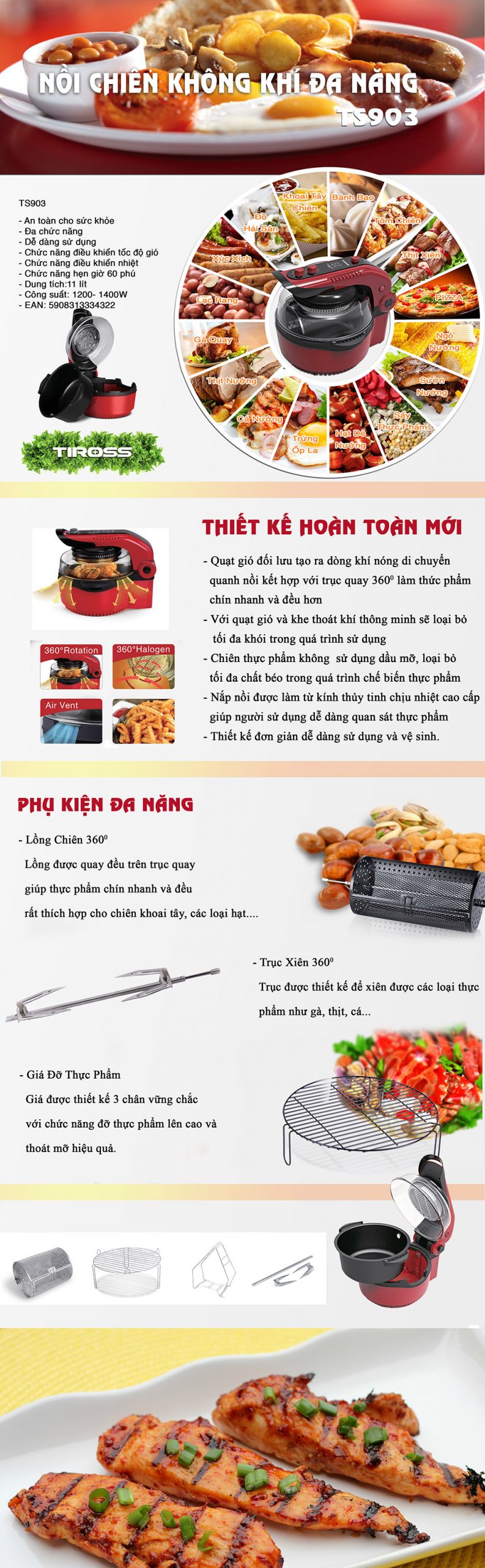Nồi chiên chân không đa năng TIROSS TS903 được thiết kế sử dụng tối đa các luồng không khí luân chuyển hoạt động liên tục và ngấm sâu vào tất cả các vị trí trên thực phẩm nên có thể làm chín thực phẩm với thời gian rất nhanh như một chiếc lò vi sóng nhưng chất lượng thực phẩm thơm ngon hơn, không bị khô và giữ được lượng nước trong thực phẩm như được chế biến trong lò nướng.