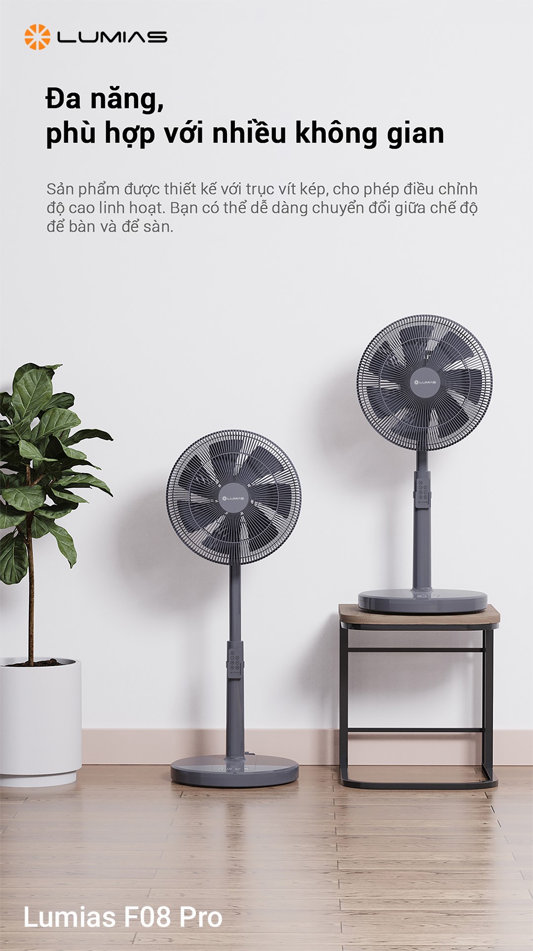 Ngoài khả năng làm mát vượt trội, quạt thông minh Lumias F08 Pro còn sở hữu thiết kế vô cùng tiện dụng. Nhờ cơ chế trục vít kép thông minh, bạn có thể dễ dàng thay đổi chiều cao của quạt, biến hóa linh hoạt giữa dạng quạt để bàn nhỏ gọn và quạt đứng cao ráo, phù hợp với mọi không gian từ phòng khách, phòng ngủ đến phòng làm việc. Thiết kế đa năng cùng vẻ ngoài hiện đại của quạt không chỉ mang lại sự thoải mái mà còn là một điểm nhấn trang trí thanh lịch cho ngôi nhà của bạn.