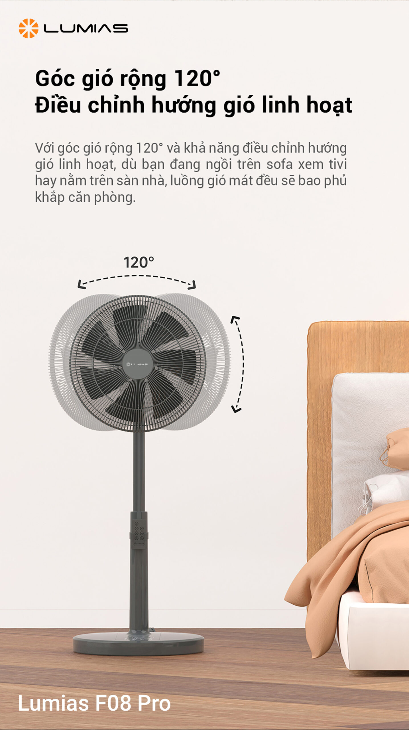Với góc thổi rộng 120° và khả năng điều chỉnh hướng gió linh hoạt, quạt thông minh Lumias F08 Pro mang đến một trải nghiệm làm mát hoàn toàn mới, giúp bạn dễ dàng tận hưởng làn gió mát dịu ở mọi ngóc ngách trong phòng. Dù bạn đang ở bất kỳ vị trí nào – làm việc tại bàn, thư giãn trên sofa hay đọc sách trên giường – luồng gió mát đều sẽ bao phủ, mang lại cảm giác thoải mái và dễ chịu liên tục.