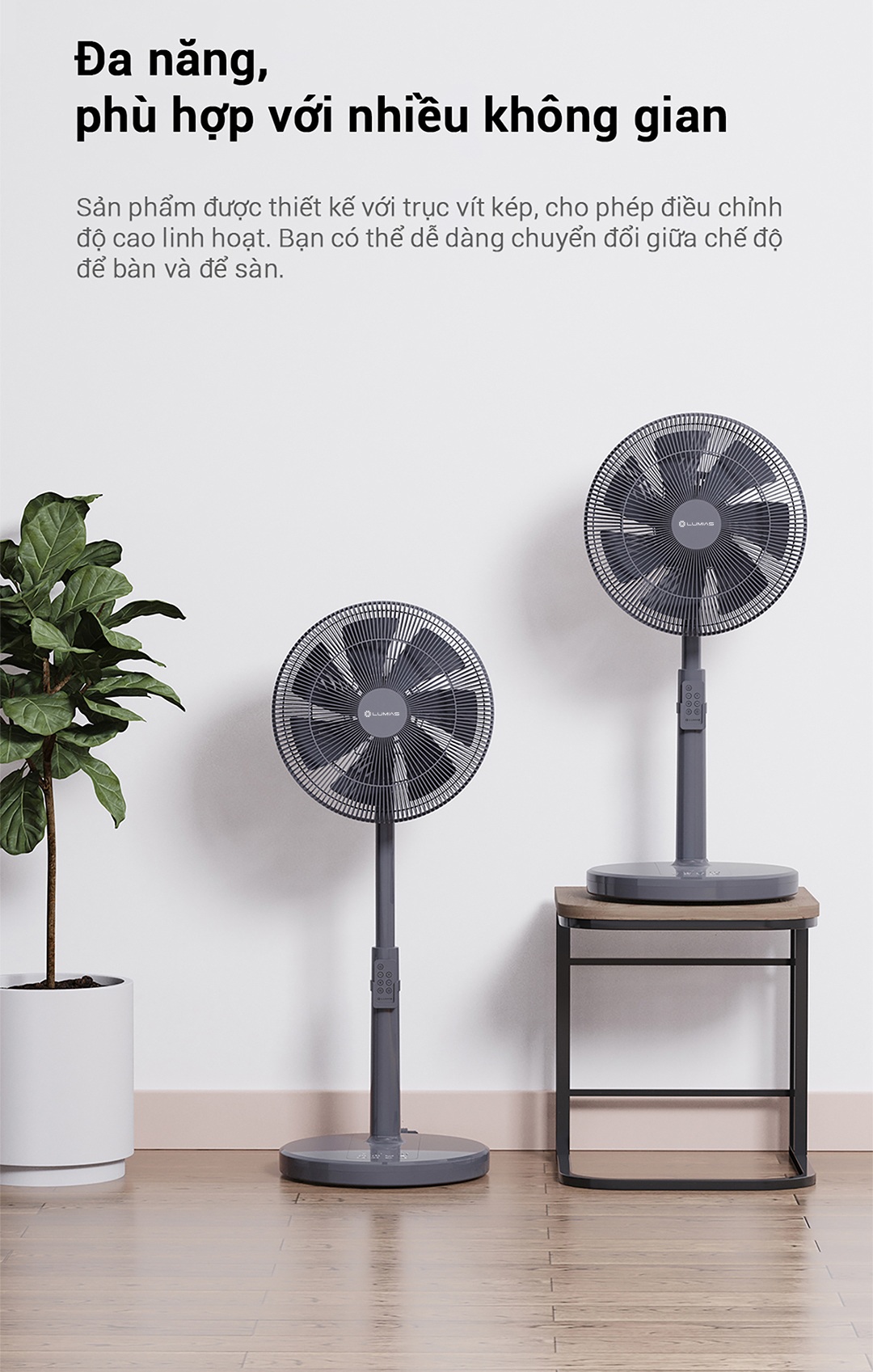 Quạt Lumias F08 không chỉ gây ấn tượng bởi khả năng làm mát hiệu quả mà còn bởi thiết kế vô cùng linh hoạt. Sản phẩm được trang bị trục vít kép, cho phép bạn điều chỉnh độ cao một cách dễ dàng và nhanh chóng. Tính năng này giúp sản phẩm thích ứng hoàn hảo với mọi không gian, từ phòng khách, phòng ngủ cho đến văn phòng làm việc. Bạn có thể linh hoạt chuyển đổi giữa chế độ để bàn và để sàn, tùy theo nhu cầu sử dụng. Với thiết kế thông minh này, đây không chỉ là một thiết bị làm mát mà còn là một món đồ nội thất trang trí tinh tế, góp phần làm tăng thêm vẻ đẹp cho không gian sống của bạn.