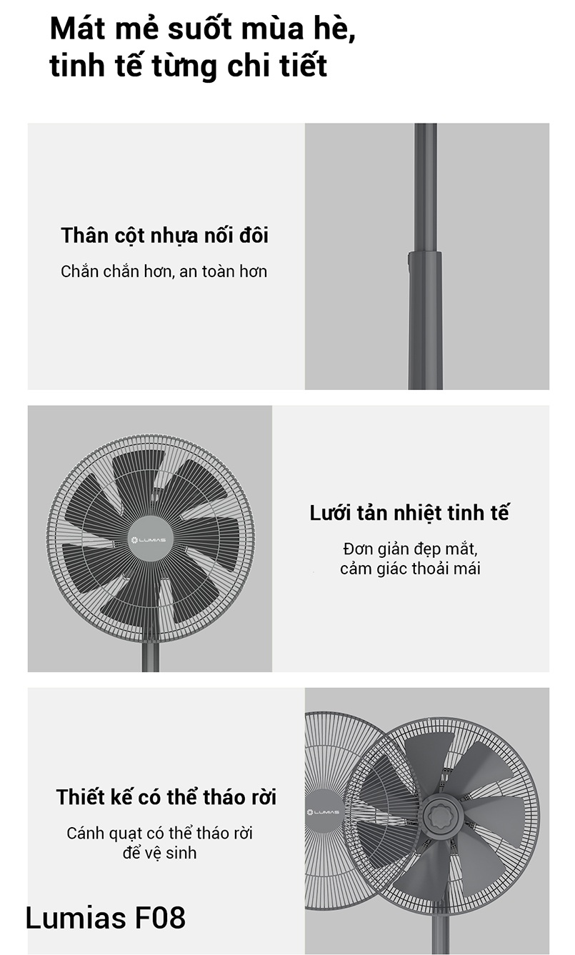 Với thiết kế tỉ mỉ đến từng chi tiết, quạt điện biến tần Lumias F08 mang đến vẻ đẹp hiện đại và sang trọng. Thân cột nhựa ABS chắc chắn không chỉ đảm bảo độ bền cao mà còn tạo cảm giác an toàn cho người sử dụng. Lưới tản nhiệt được thiết kế đơn giản nhưng tinh tế, vừa đảm bảo hiệu quả làm mát vừa tạo nên vẻ đẹp thẩm mỹ. Ngoài ra, cánh quạt có thể tháo rời tiện lợi giúp việc vệ sinh trở nên dễ dàng hơn, đảm bảo quạt luôn hoạt động ở trạng thái tốt nhất.