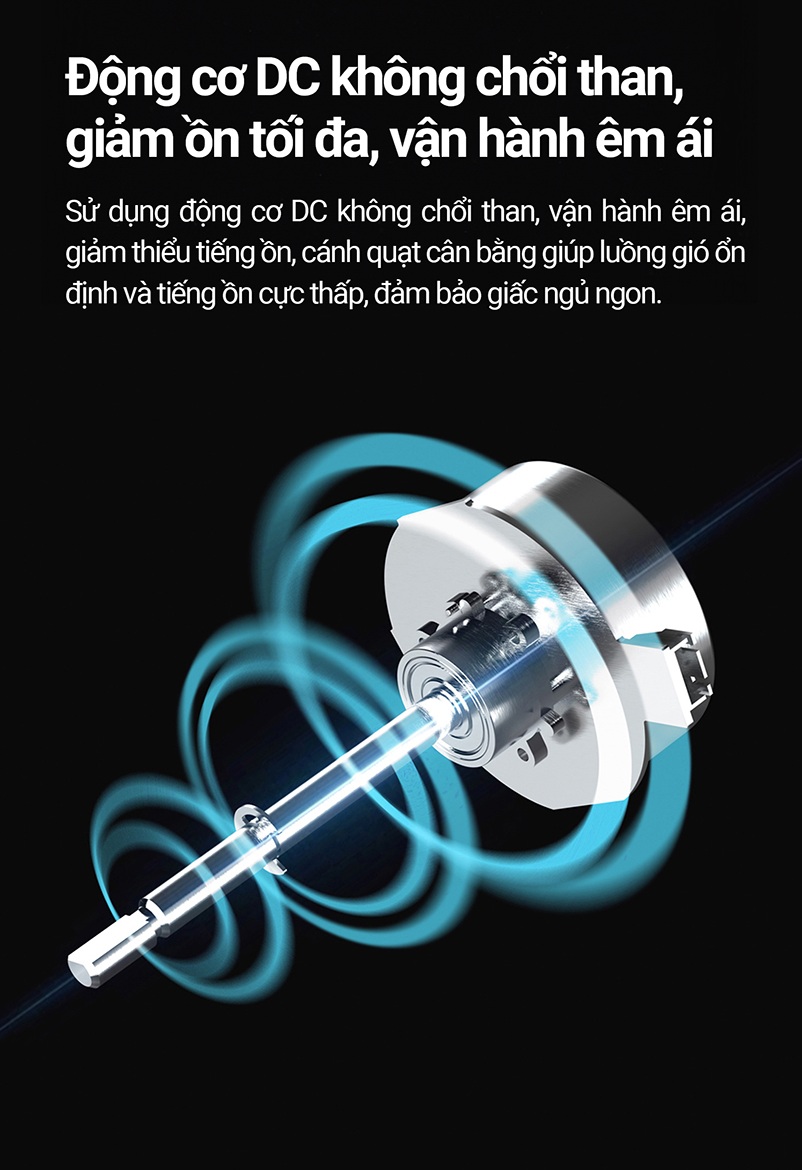 Quạt biến tần F08 được trang bị động cơ DC không chổi than, một công nghệ hiện đại mang đến trải nghiệm làm mát hoàn toàn mới. Khác với các loại động cơ truyền thống, động cơ DC không chổi than hoạt động êm ái, giảm thiểu tối đa tiếng ồn, giúp bạn có một giấc ngủ sâu và ngon hơn. Cánh quạt được thiết kế cân bằng, kết hợp với động cơ êm ái, tạo ra luồng gió ổn định, không gây ra tiếng rung hay tiếng ồn khó chịu.