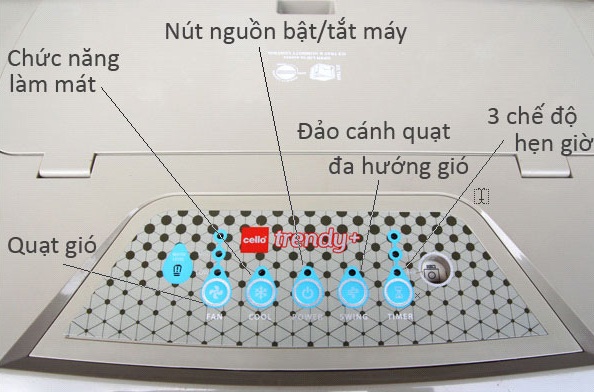 - Quạt làm mát Air Cooler Cello Trendy 30 + có 3 tốc độ gió, trang bị bánh xe giúp di chuyển nhẹ nhàng. Quạt thích hợp làm mát cho không gian mở, thoáng khí. Máy làm mát Air Cooler Cello Trendy 30 + trang bị 3 tốc độ gió, có chế độ hẹn giờ tắt tiện dụng