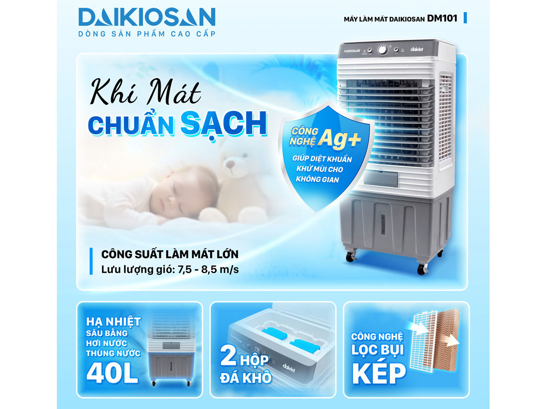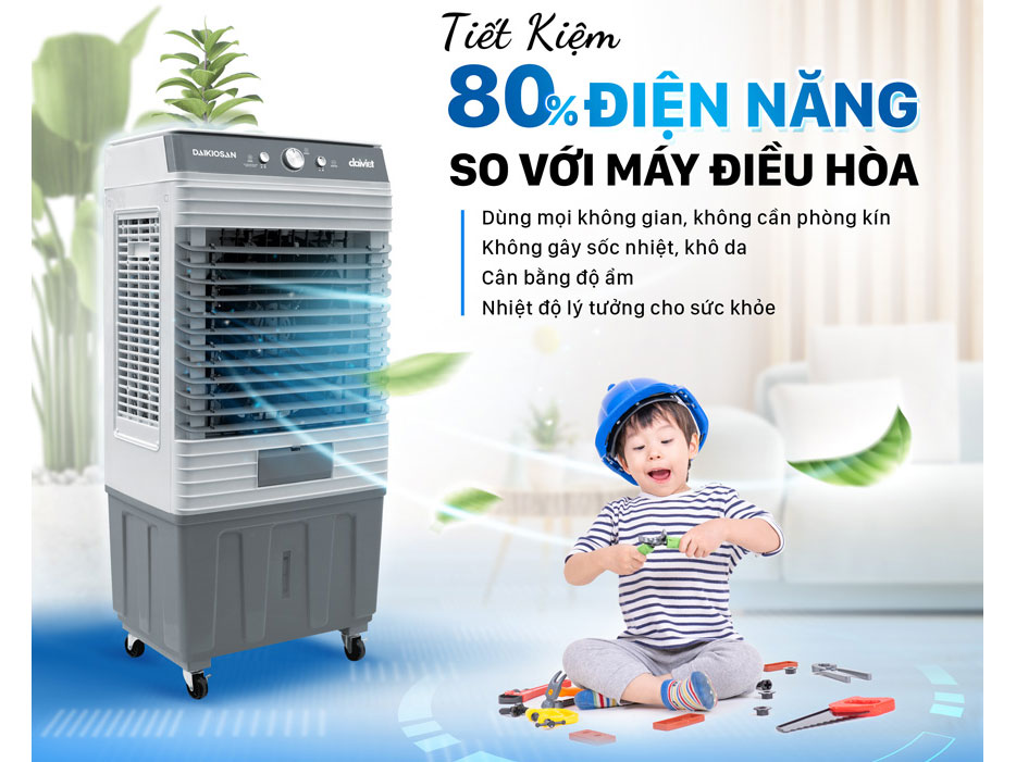 Quạt điều hòa Daikiosan là sản phẩm hoàn hảo cho các không gian như phòng khách, phòng ngủ hoặc các quán cà phê nhỏ. Với công nghệ Ag+, quạt không chỉ làm mát hiệu quả mà còn loại bỏ vi khuẩn, giúp không khí luôn trong lành. Tính năng làm mát mạnh mẽ với tốc độ gió từ 7.5 – 8.5 m/s đảm bảo mang lại cảm giác mát mẻ ngay lập tức, trong khi độ ồn thấp từ 40dB – 65dB giúp duy trì không gian yên tĩnh.