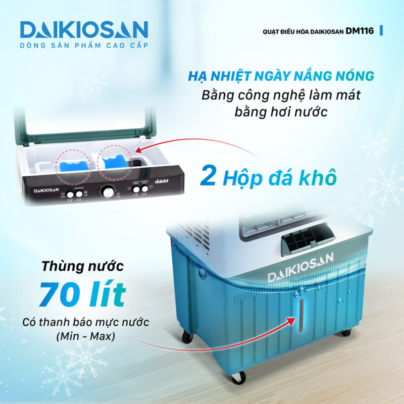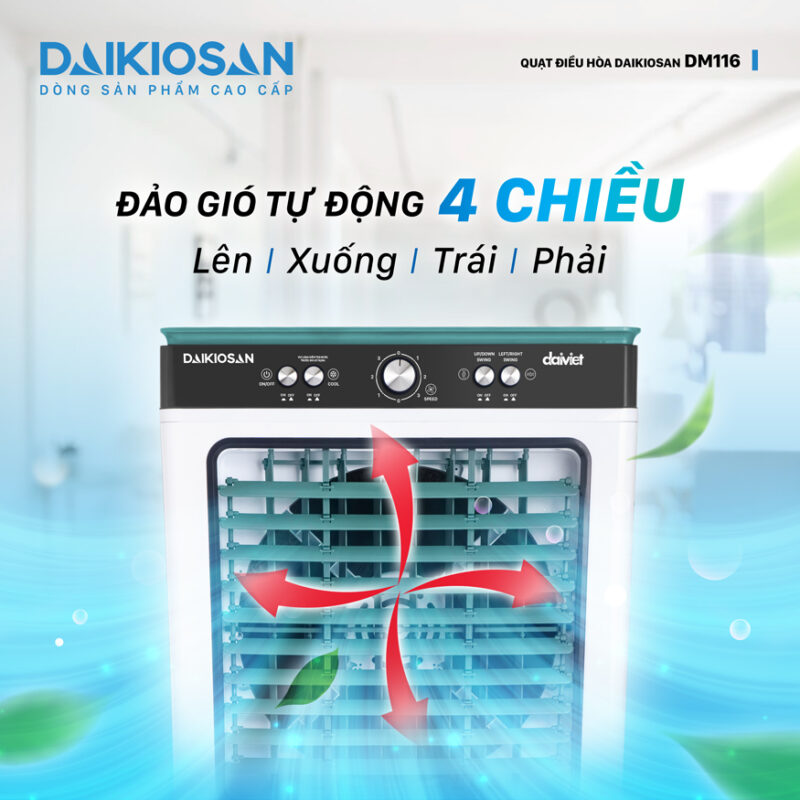 Quạt điều hòa Daikiosan DM116 sử dụng công nghệ làm mát bay hơi, giúp làm mát không khí bằng cách làm lạnh hơi nước.