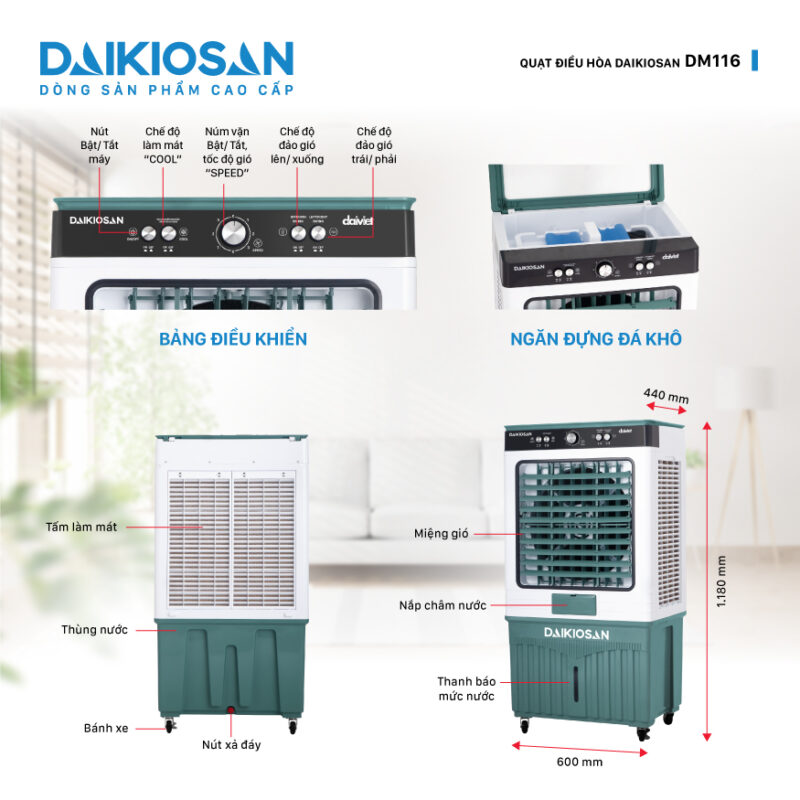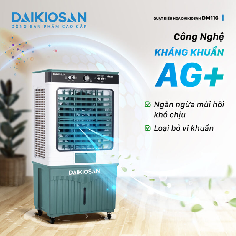 Đặc biệt, quạt điều hòa Daikiosan DM116 sử dụng công nghệ diệt khuẩn Ag+ giúp loại bỏ vi khuẩn và nấm mốc trong nước, đảm bảo luồng không khí thổi ra luôn sạch sẽ, an toàn cho sức khỏe người dùng. Điều này vô cùng quan trọng trong việc phòng ngừa các bệnh về đường hô hấp, đặc biệt là trong những ngày thời tiết hanh khô hoặc khi môi trường xung quanh bị ô nhiễm.