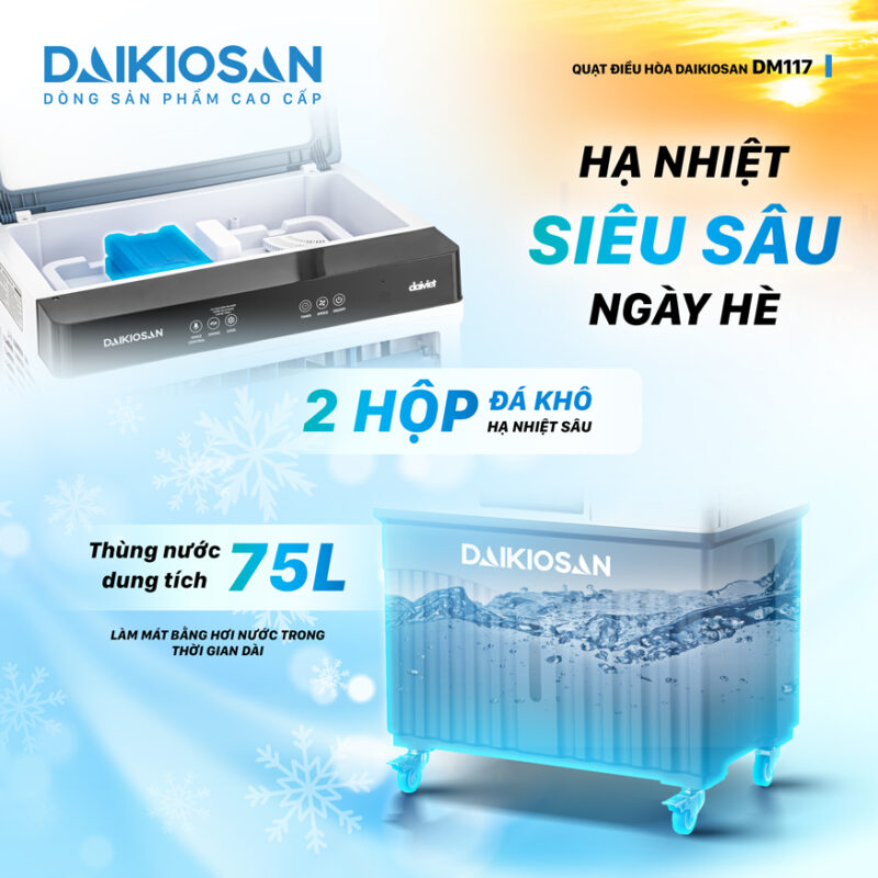 Quạt điều hòa Daikiosan DM117 sở hữu bình chứa nước dung tích 75L giúp làm mát trong thời gian dài mà không lo hết nước giữa chừng. Máy không chỉ giúp giảm nhiệt độ mà còn tạo độ ẩm vừa phải, giúp không khí trở nên dễ chịu hơn.