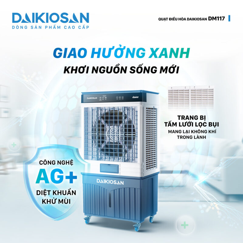 Quạt điều hòa Daikiosan DM117 được tích hợp công nghệ diệt khuẩn Ag+, giúp loại bỏ vi khuẩn, nấm mốc trong không khí, bảo vệ sức khỏe cho người dùng, đặc biệt là trẻ em và người già.