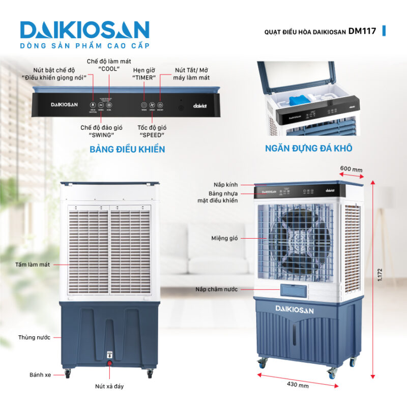 Điều khiển từ xa thông minh: Điều khiển của quạt điều hòa Daikiosan DM117 được thiết kế đơn giản và thân thiện với người dùng. Bạn có thể dễ dàng điều chỉnh tốc độ gió, hẹn giờ và các chế độ làm mát chỉ bằng vài thao tác đơn giản. Ngoài ra, bạn cũng có thể điều khiển bằng bảng điều khiển trên thân máy dễ dàng và tiện lợi.