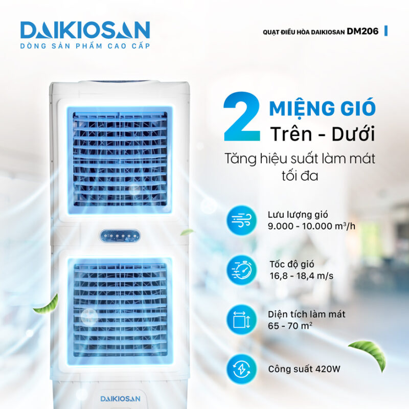 Nhờ hệ thống đảo gió bốn chiều và thiết kế hai tầng gió riêng biệt, Daikiosan DM206 có thể phân bổ luồng không khí đều khắp không gian, mang lại hiệu quả làm mát tối ưu mà vẫn tiết kiệm điện năng.