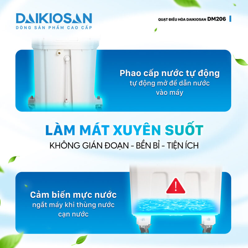 Quạt điều hòa Daikiosan DM206 ứng dụng công nghệ bay hơi nước tiên tiến, mang đến luồng không khí mát mẻ tự nhiên, giúp giảm nhiệt nhanh chóng mà không gây khô da.