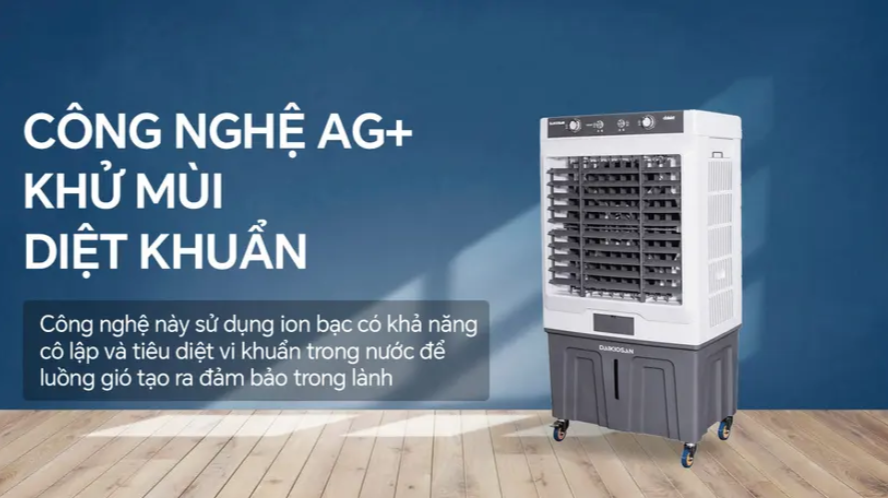 Quạt điều hòa Daikiosan DM210 sở hữu công nghệ diệt khuẩn Ag+, là công nghệ độc đáo tạo nên sự khác biệt so với nhiều sản phẩm cùng loại trên thị trường. Đây là công nghệ sử dụng ion bạc giúp cô lập và tiêu diệt vi trùng, vi khuẩn trong bình chứa nước mang đến làn không khí trong lành, sạch mát.