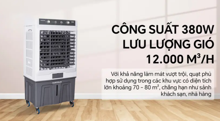 Quạt điều hòa Daikiosan DM210 được thiết kế với nhiều tính năng tối ưu lưu lượng gió lên đến 12.000 m³/h, cùng tốc độ gió 11 m/s, cùng công suất 380W giúp nâng cao hiệu suất làm mát. Siêu phẩm không chỉ làm mát một khu vực mà còn lan tỏa không khí mát mẻ khắp căn phòng có diện tích 70 – 80m2.
