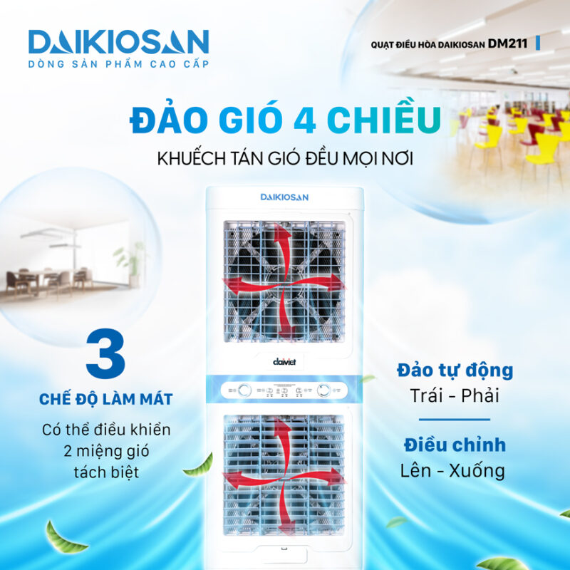 Quạt điều hoà Daikiosan DM211 được thiết kế đặc biệt 2 tầng, 2 miệng gió, 2 cánh quạt có thể tự điều chỉnh nhờ hệ thống bảng điều khiển trên máy.