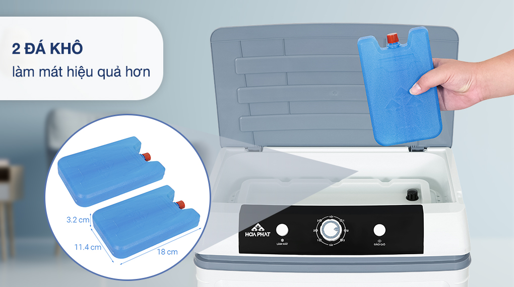– Đi kèm 2 đá khô nâng cao hiệu suất làm mát. Đây là 1 loại đá hóa học, khi muốn làm lạnh, bạn cho vào ngăn đá tủ lạnh (đá này có thể tái sử dụng) rồi đặt vào bình chứa nước, đá khô sẽ làm lạnh nước cho hơi nước tỏa ra mát sâu hơn.