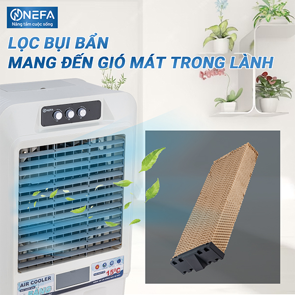 Quạt điều hòa Nefa CC90 bao gồm hệ thống đẩy nước rải nước ở thân sau của máy làm mát không khí bằng hơi nước, tạo điều kiện cho quạt hút được nhiều không khí mát hơn.