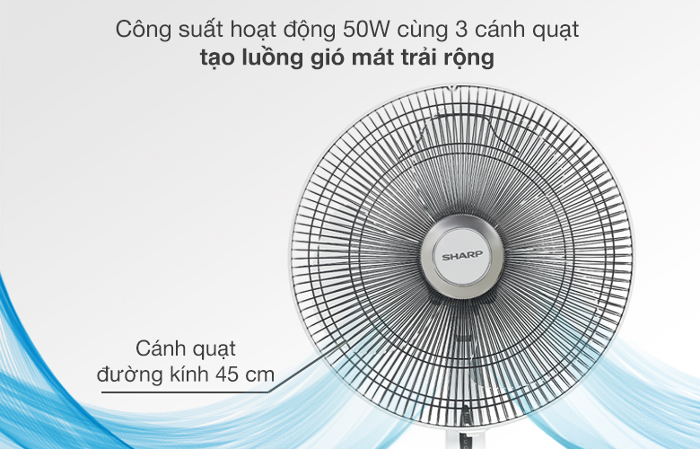Quạt có công suất hoạt động 50W, 3 cánh quạt đường kính 45 cm, sải cánh rộng tạo lưu lượng gió mạnh làm mát cực tốt cho diện tích phòng rộng