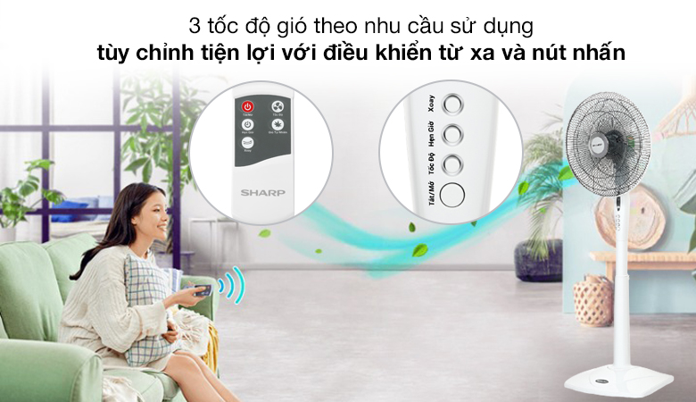 Điều khiển bằng nút nhấn đơn giản với 3 tốc độ gió tùy chọn theo nhu cầu sử dụng và thời điểm dùng quạt trong ngày