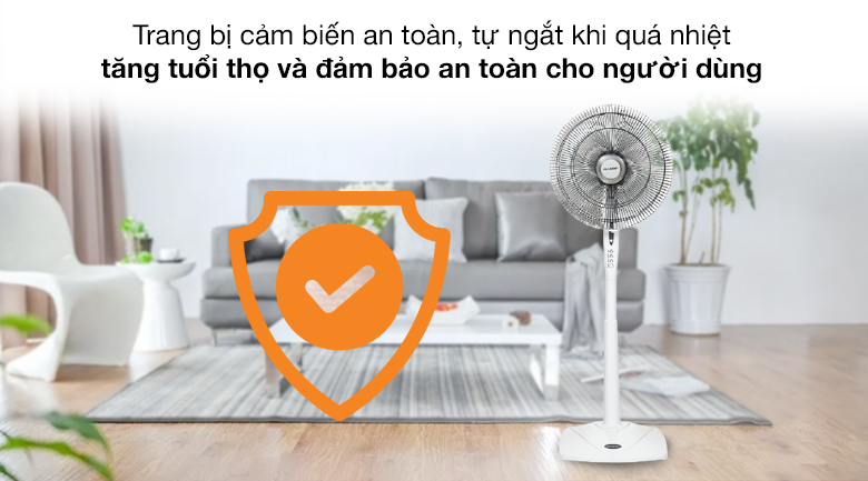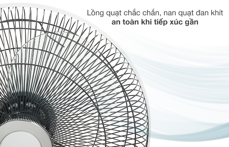 Lồng quạt chắc chắn, nan quạt đan khít, đảm bảo an toàn khi tiếp xúc ở khoảng cách gần, thiết kế dễ tháo rời lồng quạt vệ sinh