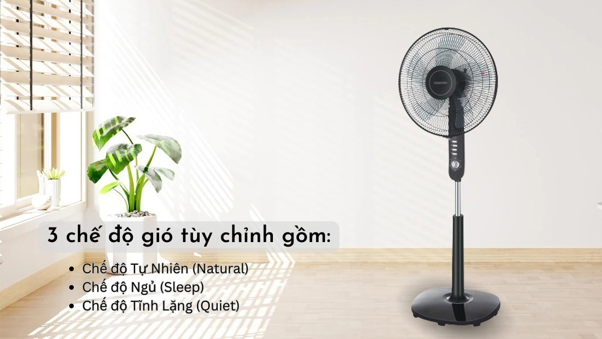 Toshiba F-LSA10(K)VN được tích hợp 3 chế độ gió khác nhau, giúp người dùng có thể thiết lập tùy ý theo nhu cầu sử dụng của bản thân hoặc các thành viên khác trong gia đình. Các chế độ gió của quạt bao gồm: