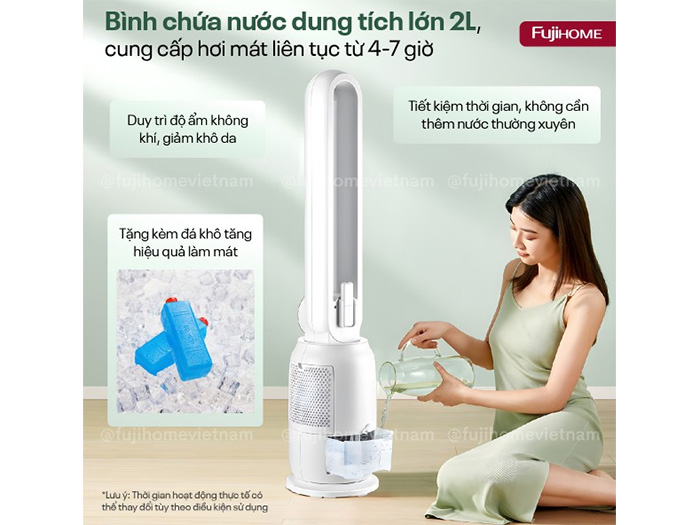 Quạt không cánh được trang bị bình chứa nước dung tích 2 lít, dễ tháo rời và vệ sinh. Bình nước còn tích hợp gương chỉ báo mực nước giúp người dùng tiện quan sát. Kèm theo đó là 2 hộp đá khô sẽ tăng cường khả năng làm mát. Đặc biệt, công nghệ hơi nước siêu nano giúp cân bằng độ ẩm mà không gây ảnh hưởng đến thiết bị điện tử.