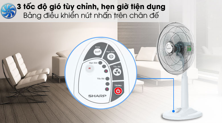 Quạt điều chỉnh 3 tốc độ gió với bảng điều khiển nút nhấn đơn giản, có chế độ hẹn giờ tiện lợi
