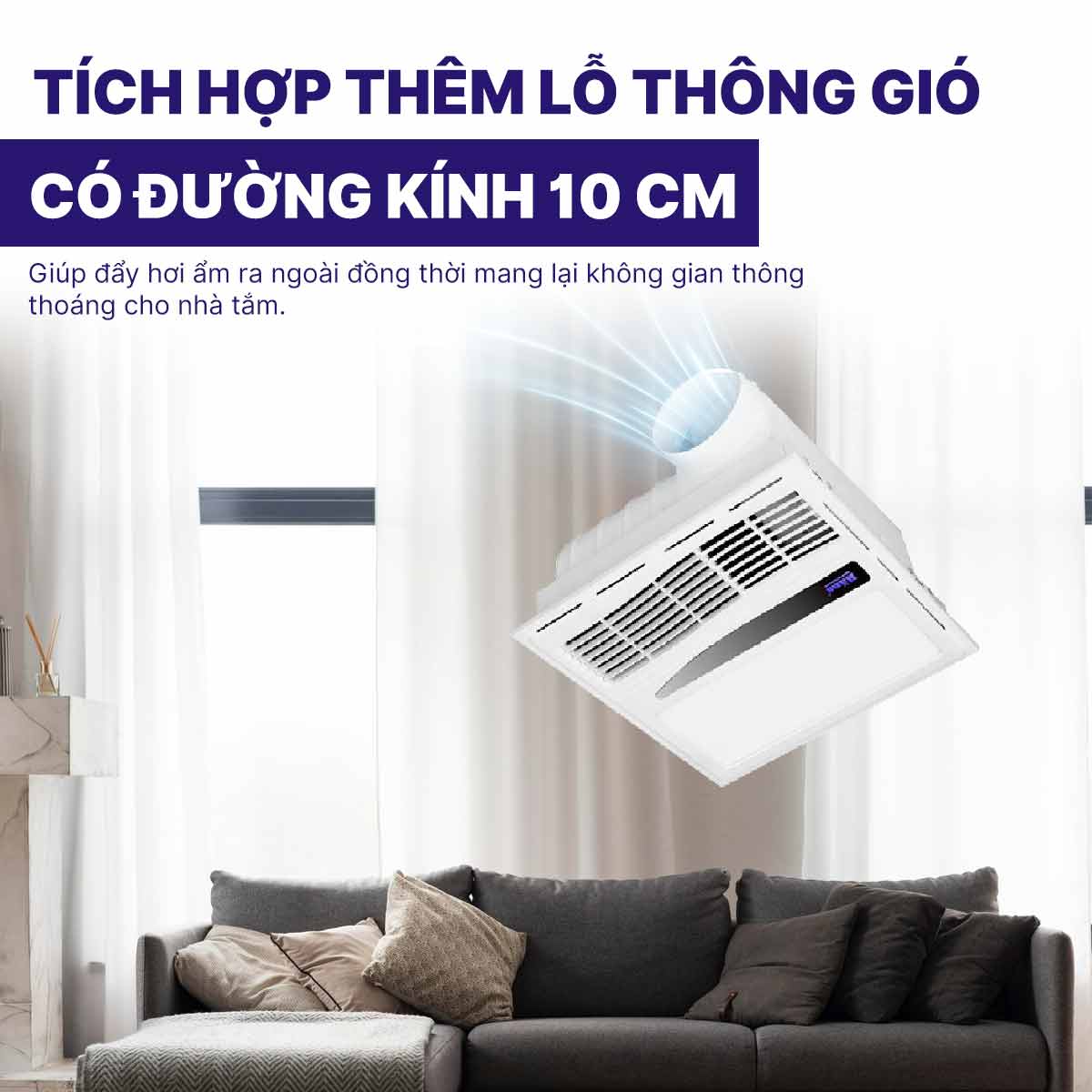 Quạt sưởi âm trần Hans HA-R còn tích hợp thêm lỗ thông gió có đường kính 10 cm giúp đẩy hơi ẩm ra ngoài đồng thời mang lại không gian thông thoáng cho nhà tắm.
