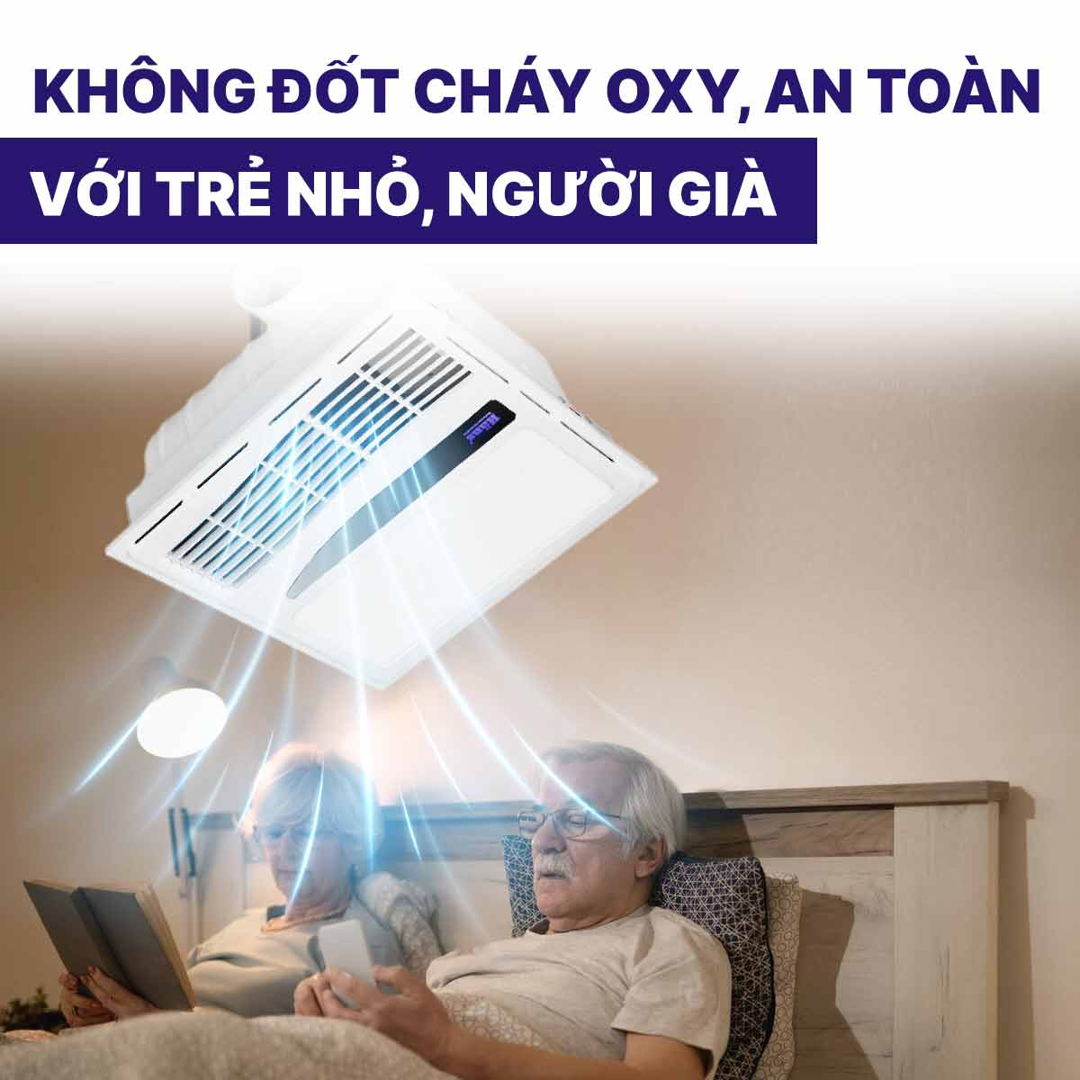 Vì thường lắp đặt trong không gian hẹp nên quạt tỏa ra hơi ấm không đốt cháy oxy, không làm khô da, không gây khó thở, bạn có thể an tâm sử dụng thường xuyên mà không lo ảnh hưởng tới sức khoẻ nhé. Đặc biệt đây là sản phẩm an toàn với trẻ nhỏ, người già, đặc biệt khi chăm sóc người sức khoẻ yếu, sợ gió và sợ nước.
