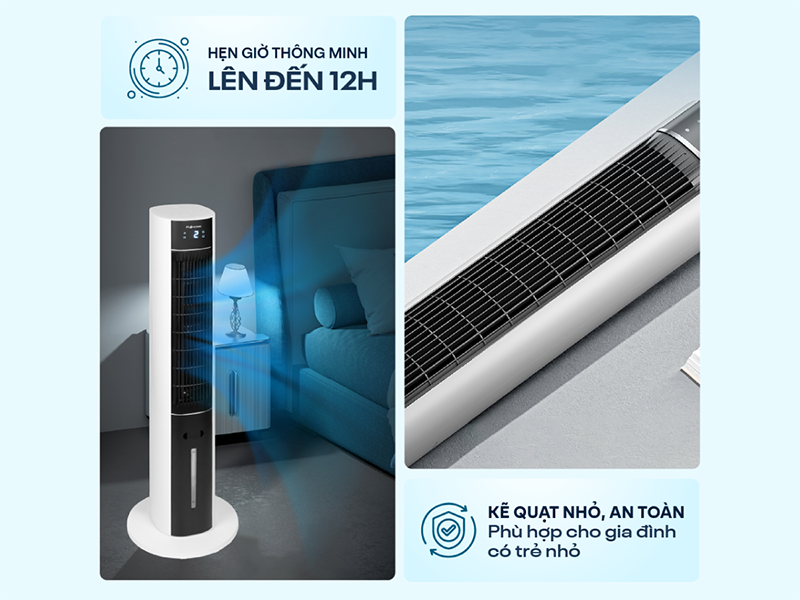 Quạt tháp hơi nước Fujihome AC-18LE được trang bị tính năng hẹn giờ linh hoạt từ 1 – 12 tiếng, cho phép bạn cài đặt thời gian tắt quạt tự động theo nhu cầu. Nhờ đó, bạn có thể yên tâm ngủ ngon mà không cần thức dậy giữa đêm để tắt thiết bị. Tính năng này không chỉ giúp tiết kiệm điện năng, mà còn góp phần kéo dài tuổi thọ của quạt nhờ tránh hoạt động liên tục không cần thiết. Đặc biệt hữu ích cho người có thói quen dùng quạt khi ngủ hoặc những lúc bận rộn, quên tắt thiết bị.