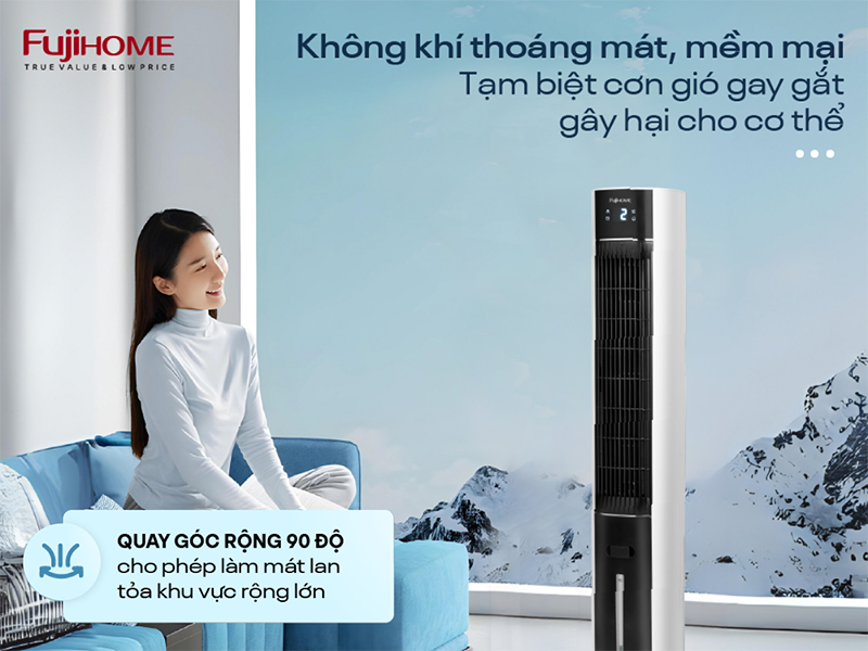 Quạt tháp hơi nước tích hợp lọc không khí Fujihome AC-18LE có thiết kế không cánh hiện đại kết hợp với ống dẫn khí xoay, tạo luồng gió dịu nhẹ, thoải mái mà không gây bạt gió hay cảm giác đau đầu khi sử dụng lâu. Với công suất 43W, thiết bị mang lại hiệu quả làm mát nhanh chóng nhưng vẫn đảm bảo tiết kiệm điện năng, phù hợp sử dụng hàng ngày trong mọi không gian sống. Góc xoay rộng đến 90 độ giúp quạt phân bổ luồng khí đều khắp phòng, làm mát toàn diện và hiệu quả.