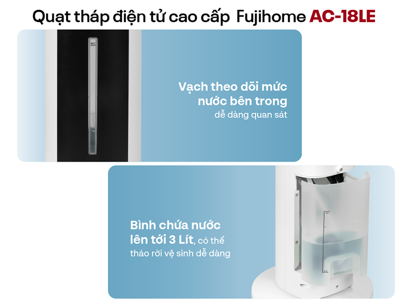 Fujihome AC-18LE không chỉ là chiếc quạt làm mát thông thường, mà còn tích hợp chế độ làm mát bằng hơi nước, tăng cường độ ẩm và giảm cảm giác khô da khi sử dụng lâu, đặc biệt hiệu quả trong thời tiết hanh khô hoặc khi kết hợp với điều hòa. Quạt được trang bị bình chứa nước dung tích 3 lít, đủ dùng trong nhiều giờ mà không cần châm nước liên tục. Thiết kế bình kéo rời dễ dàng tháo lắp, thuận tiện cho việc châm nước và vệ sinh. Ngoài ra, thông qua thang đo mực nước rõ ràng, bạn dễ dàng theo dõi lượng nước còn lại để kịp thời bổ sung, tránh gián đoạn trong quá trình sử dụng.
