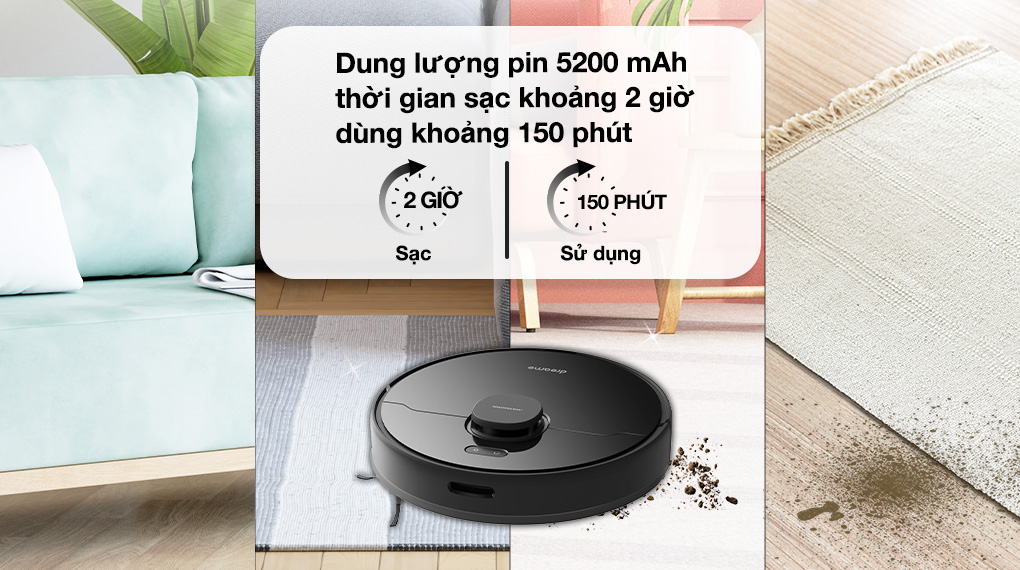 – Pin dung lượng 5200 mAh cung cấp cho máy khả năng hút bụi, lau dọn diện tích lớn chỉ với một lần sạc đầy. Khi gần hết pin, robot sẽ tự động quay về trạm sạc và tiếp tục làm sạch sau khi sạc đầy pin. Sau khi sạc đầy, robot sẽ quay trở lại vị trí đang dọn dẹp dang dở để tiếp tục chương trình làm sạch trước đó.