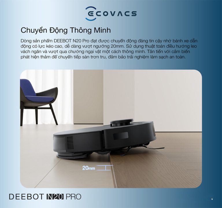 Bánh xe dẫn động có lực kéo cao, nên Ecovacs N20 Pro dễ dàng vượt qua các vật cản có ngưỡng cao đến 20mm. Vì vậy, N20 Pro được đánh giá là dòng robot thế hệ mới có độ linh hoạt và khả năng di chuyển cực kỳ ấn tượng. Bên cạnh đó, robot được tân trang thuật toán điều hướng tiên tiến, giúp vượt qua vật cản một cách thông minh và dễ dàng hơn.