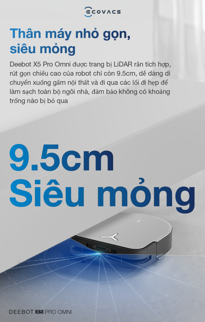 Thân máy Ecovacs Deebot X5 Pro OMNI có thiết kế hình chữ D, vừa mỏng vừa gọn gàng, mang đến giải pháp làm sạch góc và cạnh tối ưu, cho trải nghiệm hút bụi và làm sạch hài lòng hơn.
